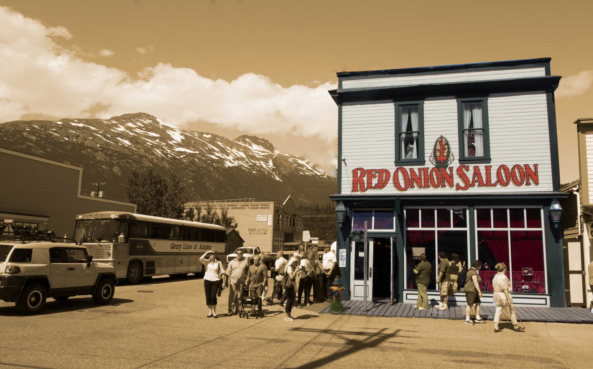 A visit to Skagway is not complete without a stop at historic Red Onion Saloon. Located on the corner of 2nd & Broadway, the establishment is a favorite among visitors and locals alike. Built in 1897, the original Red Onion Saloon operated as one the finest bordellos in Skagway. Though times have changed, the spirit has not. What was once the classiest dance hall and saloon in the bustling gold rush town of Skagway, the sense of history and excitement has not been lost. Come and enjoy what Skagway’s favorite saloon, restaurant and brothel museum has to offer!